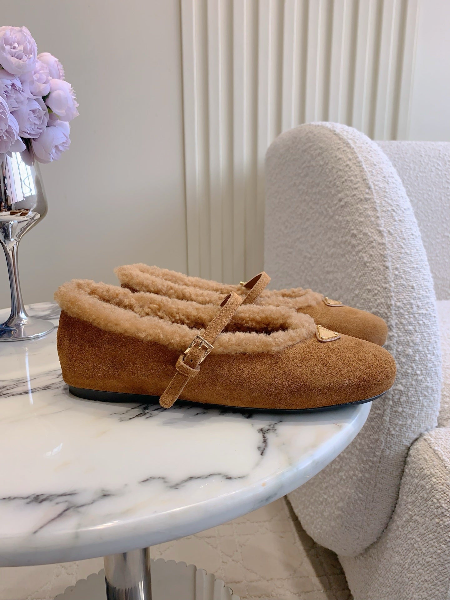 Pra 2025 Fur-lined Flat Tan Suede Wool 557121