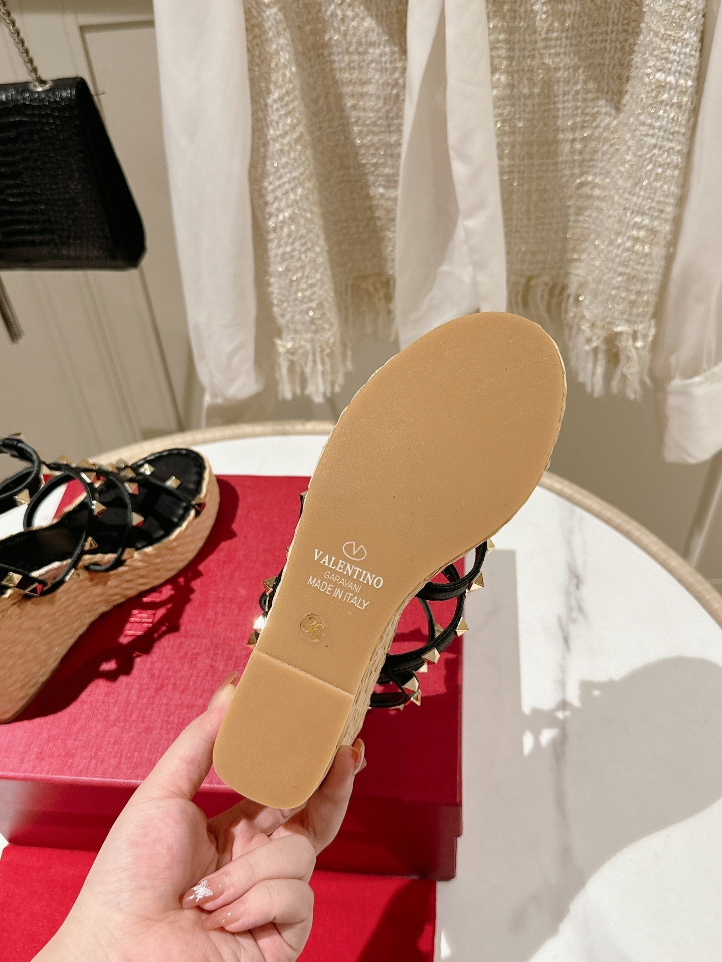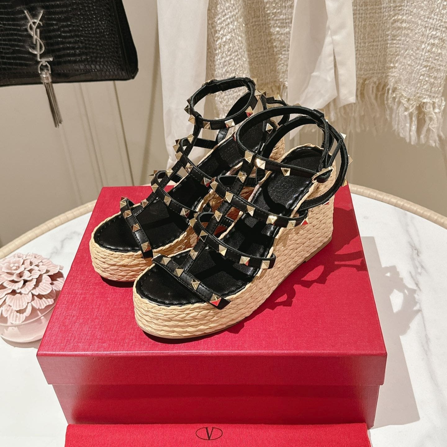 ROCKSTUD ANKLE STRAP WEDGE SANDAL IN BLACK CALFSKIN LEATHER 95 MM