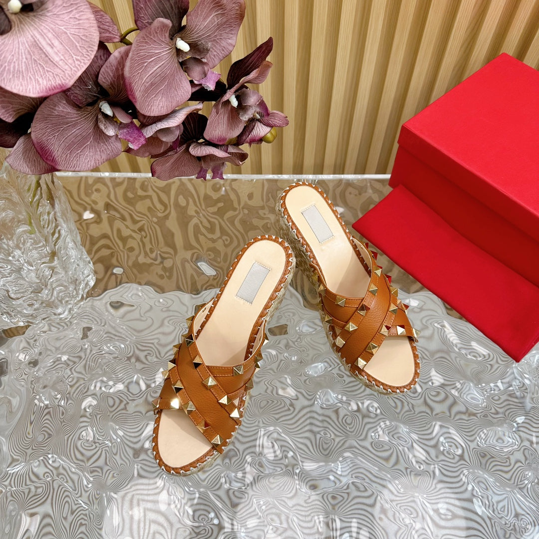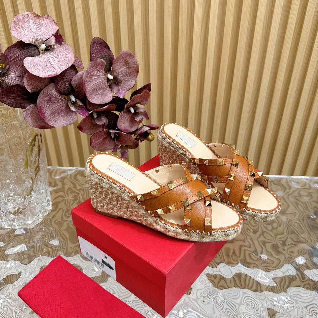 Rockstud Crisscross Espadrilles 80mm Sandal Wedges Brown