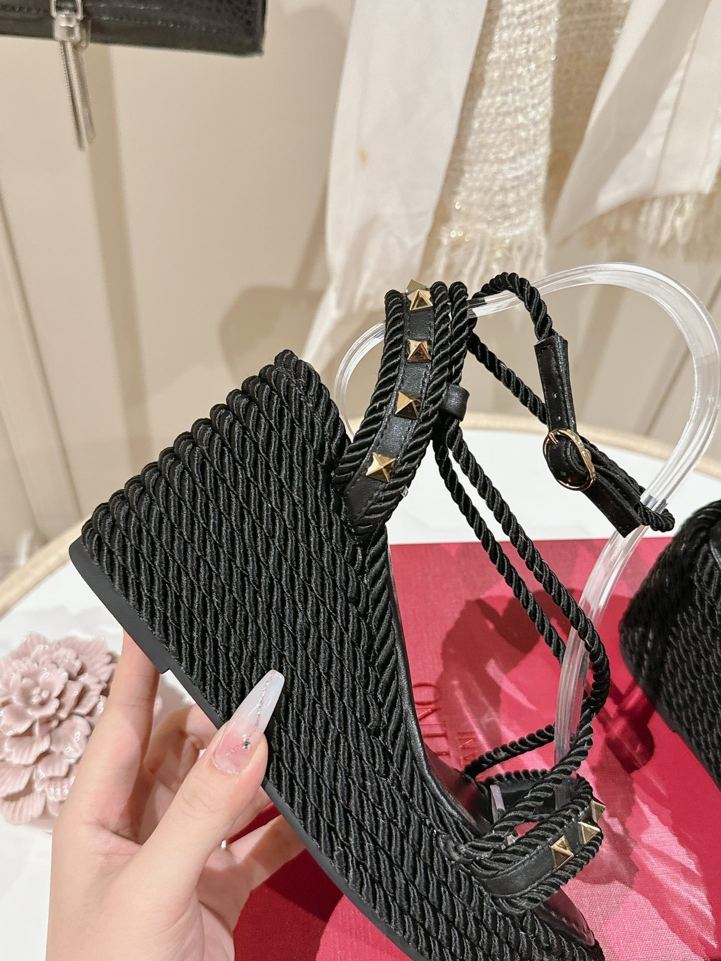 Rockstud Flatform Sandal 10mm In Black Calfskin And Nylon Rope 829393
