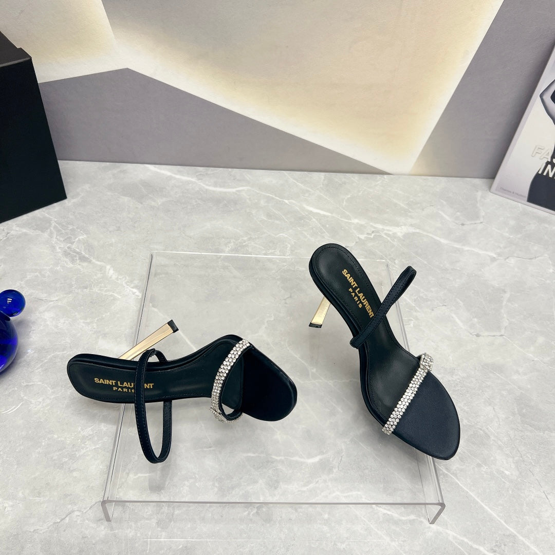 SL CRYSTAL THIN BELT HIGH HEELS BLACK SATIN