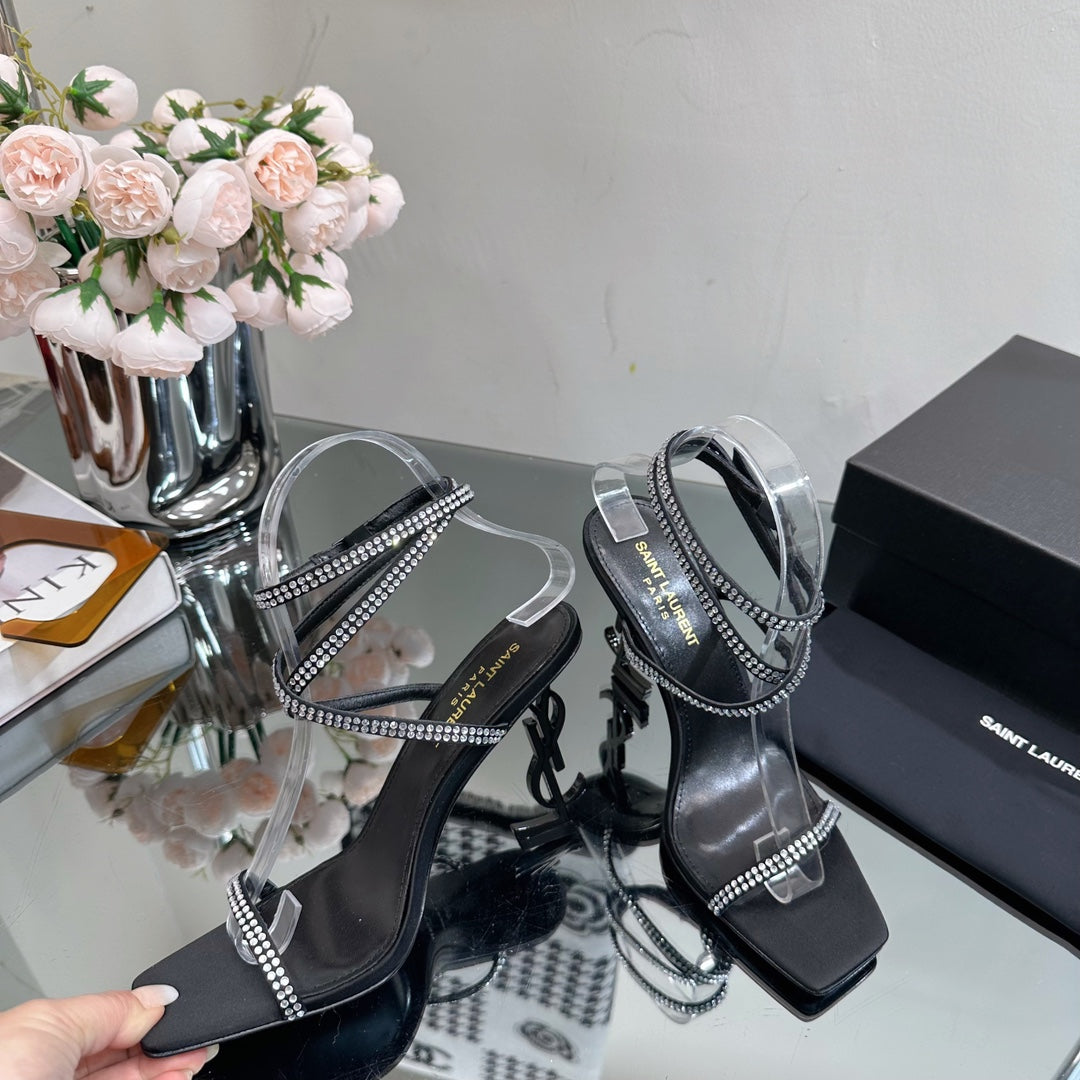 SL OPYUM WHITE CRYSTAL HEELED SANDALS BLACK SATIN