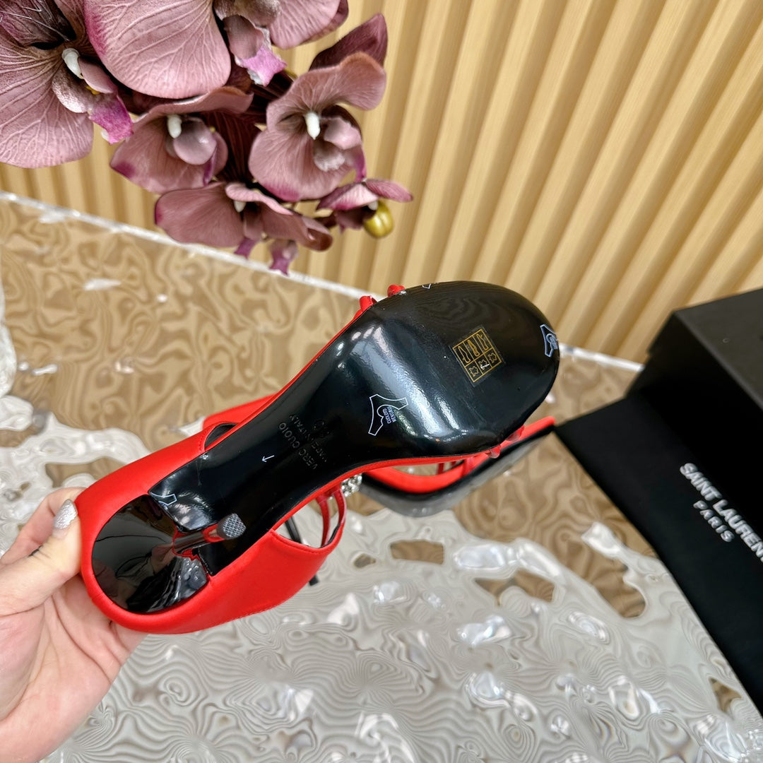 SL POM CIRCLE CRYSTAL HEELED SANDALS RED SATIN