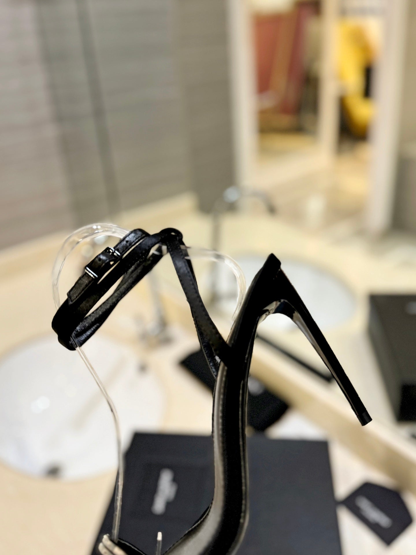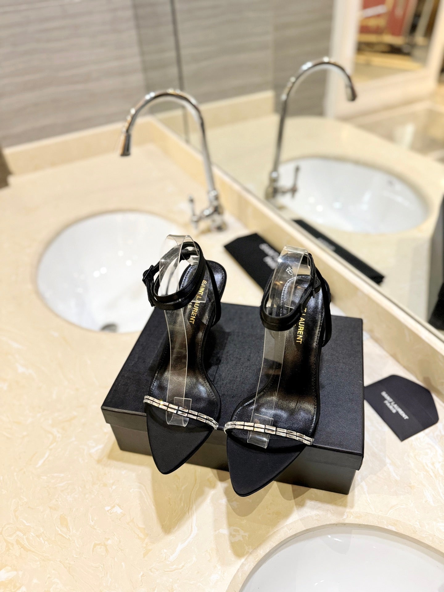 SL RHINESTONE HEELED SANDALS BLACK SATIN