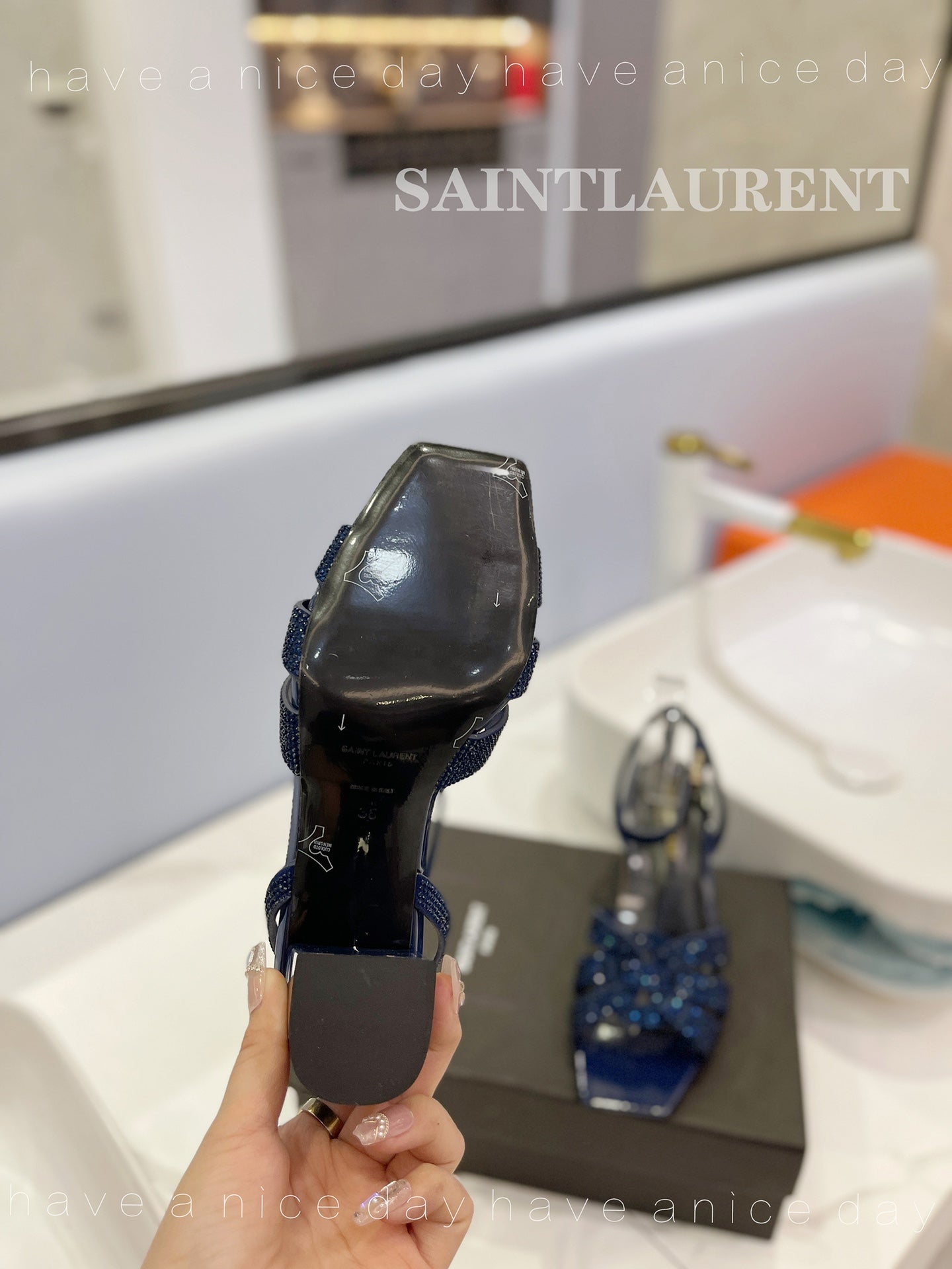 SL TRIBUTE CRYSTAL SANDALS GLOSSY NAVY CALFSKIN