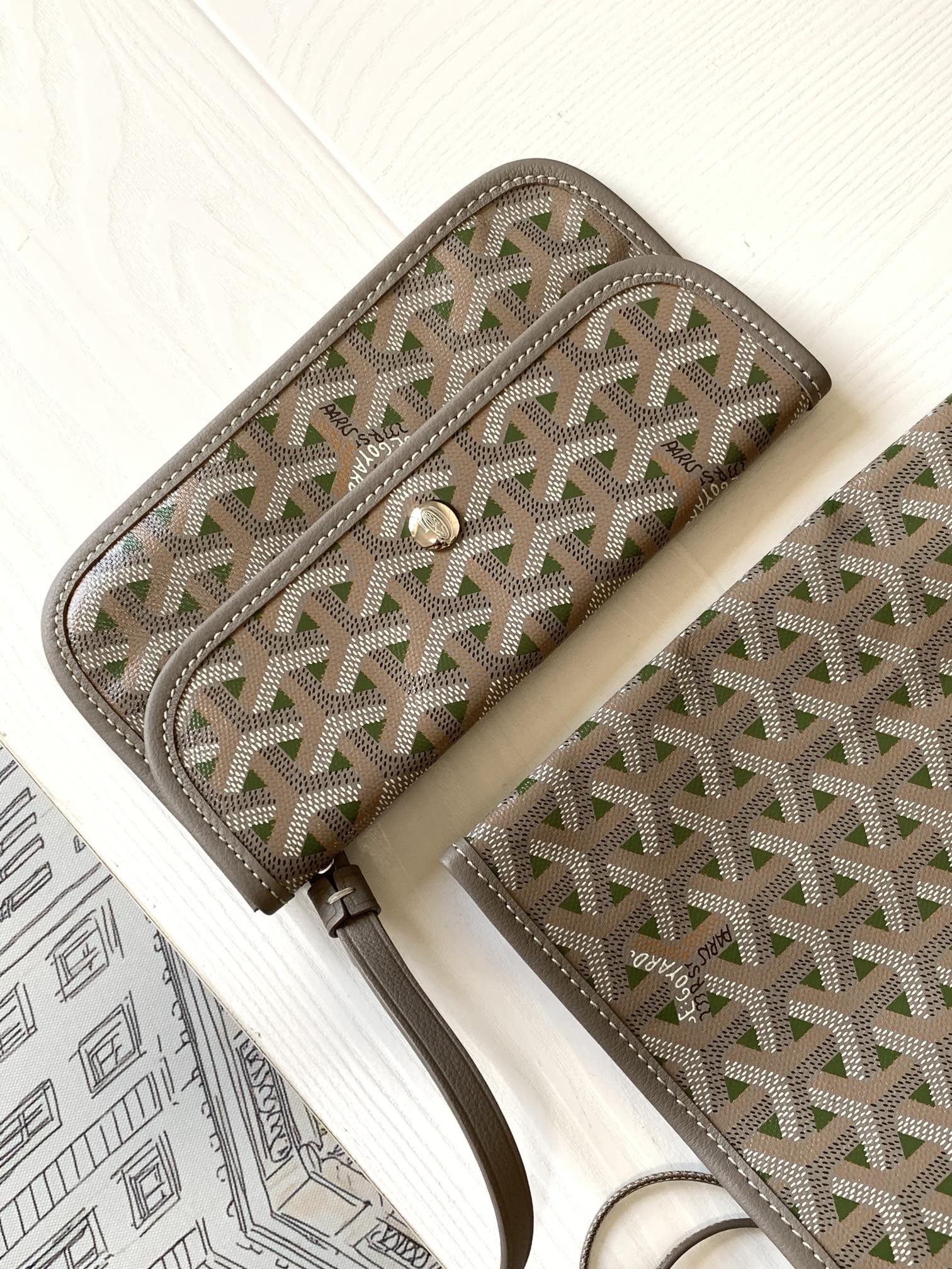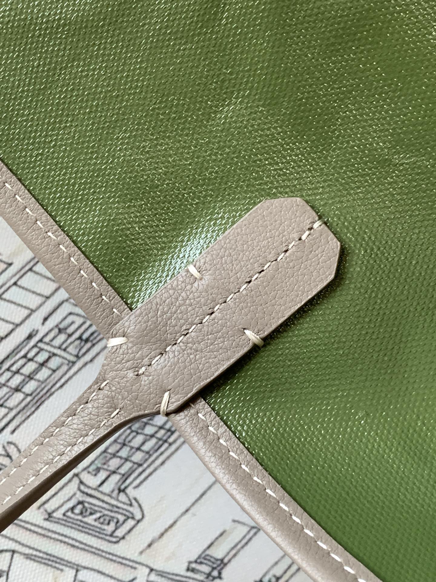 - Material: This St. Louis PM tote is in Greige and Green Goyardine canvas with palladium hardware and features greige leather handles and trim, removable pouch and white stitching.