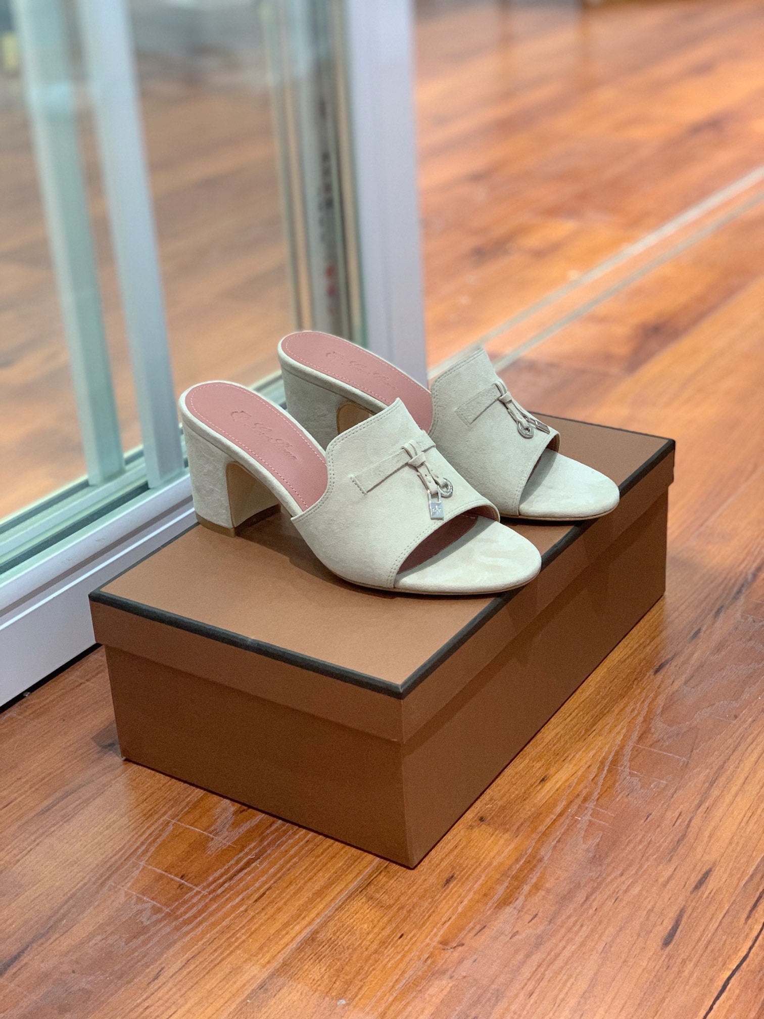 Summer Charms Mules 80 Earthy Gray Suede Pink Lambskin