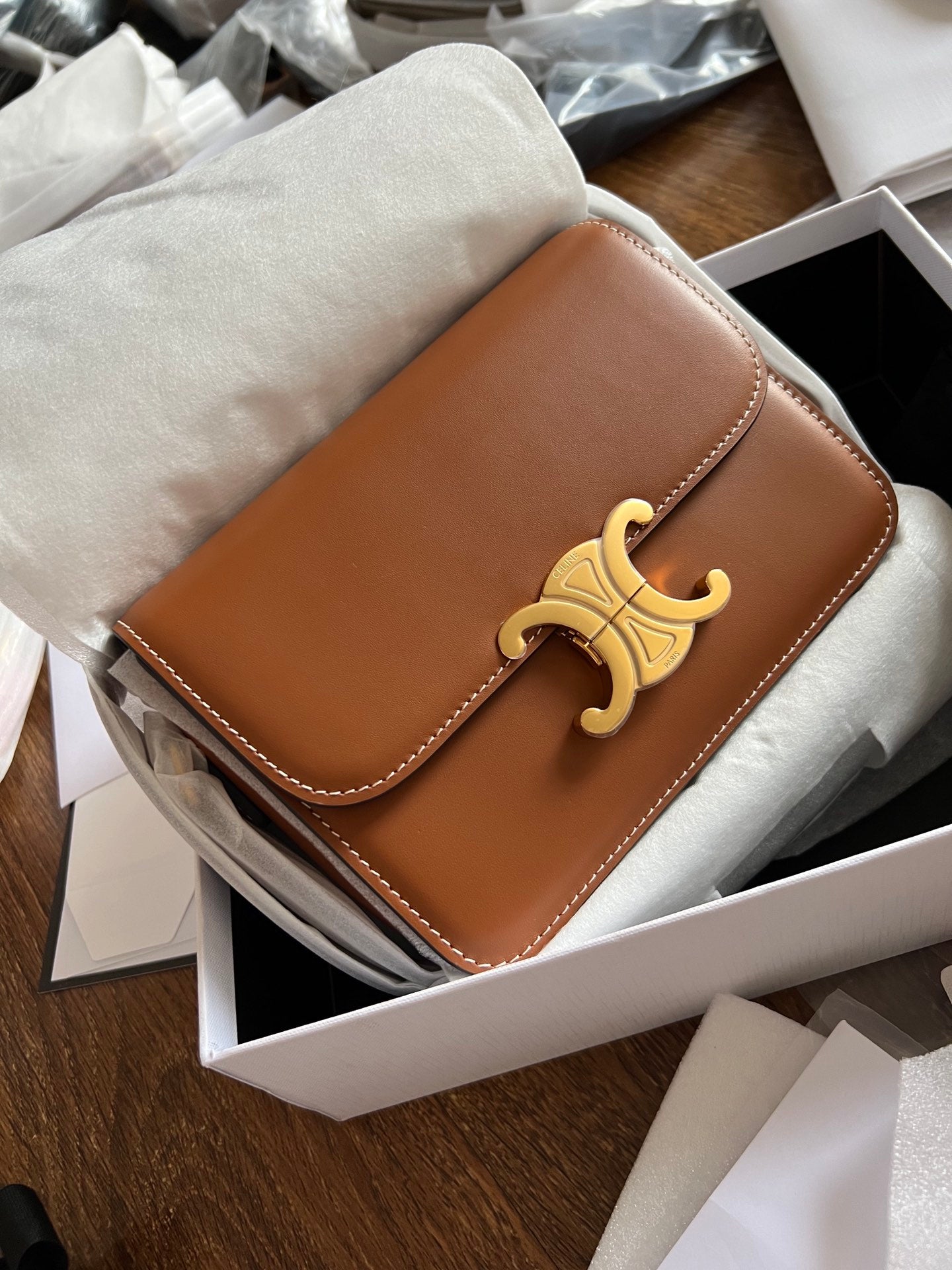 - Color: Brown leather, Gold hardware