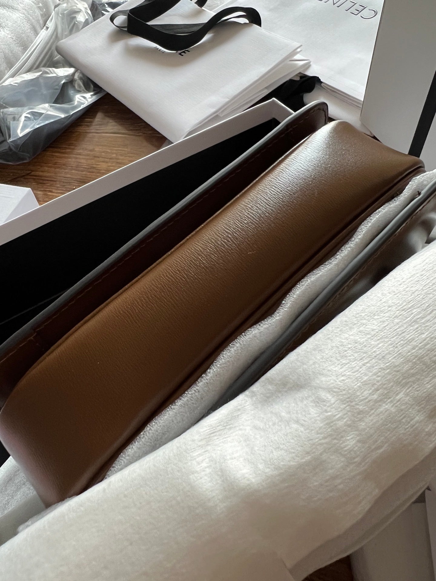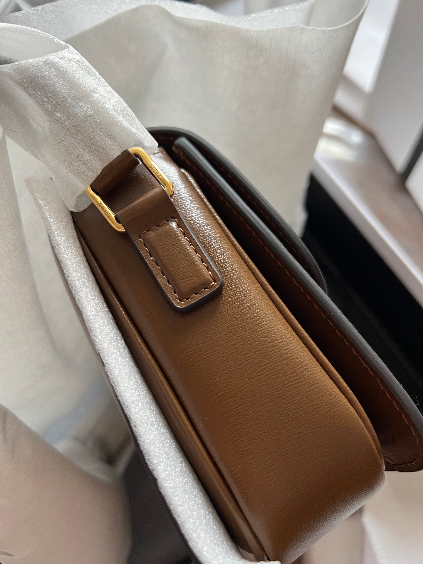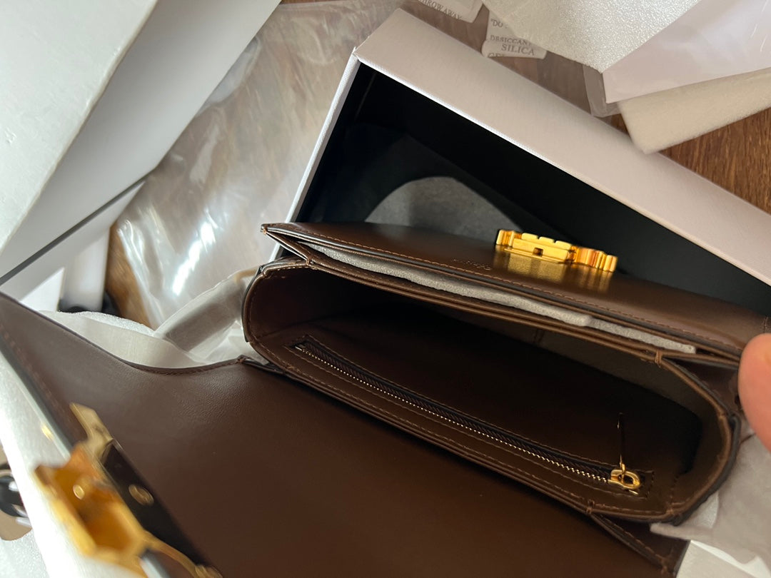 - Color: Dark Brown leather, Gold hardware