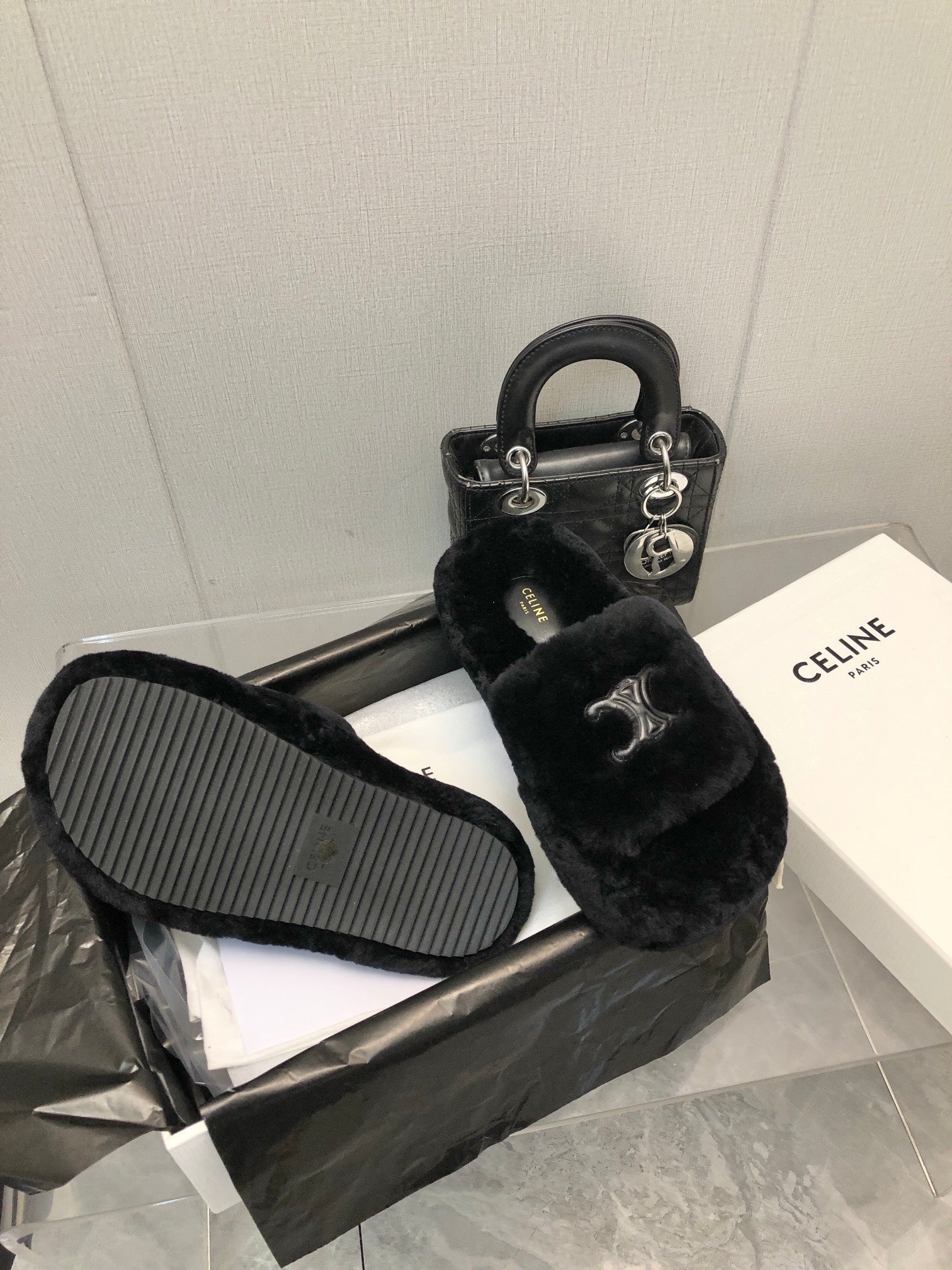THICK-SOLED SLIPPER IN BLACK LAMB FUR