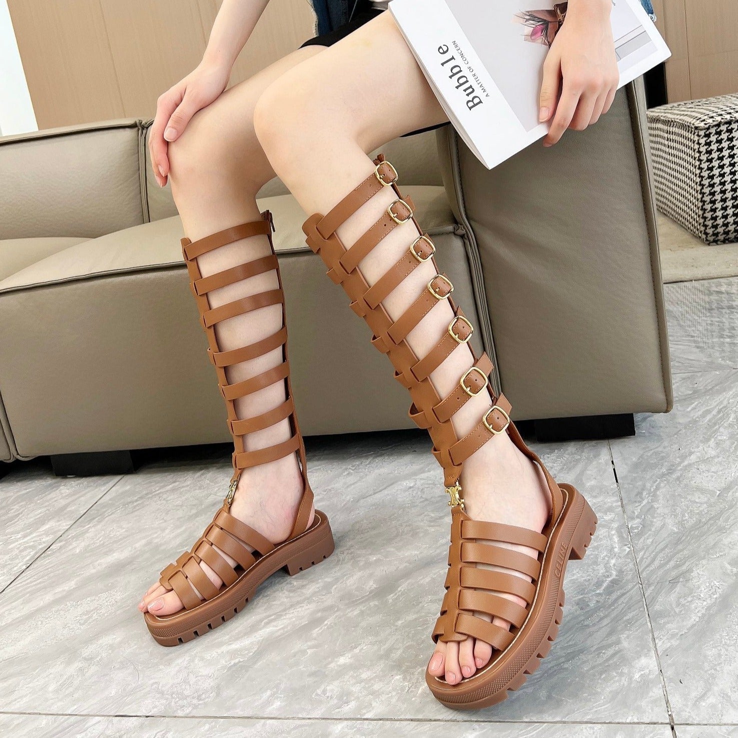 Triomphe high boots leather buckles Ginggerbread Brown