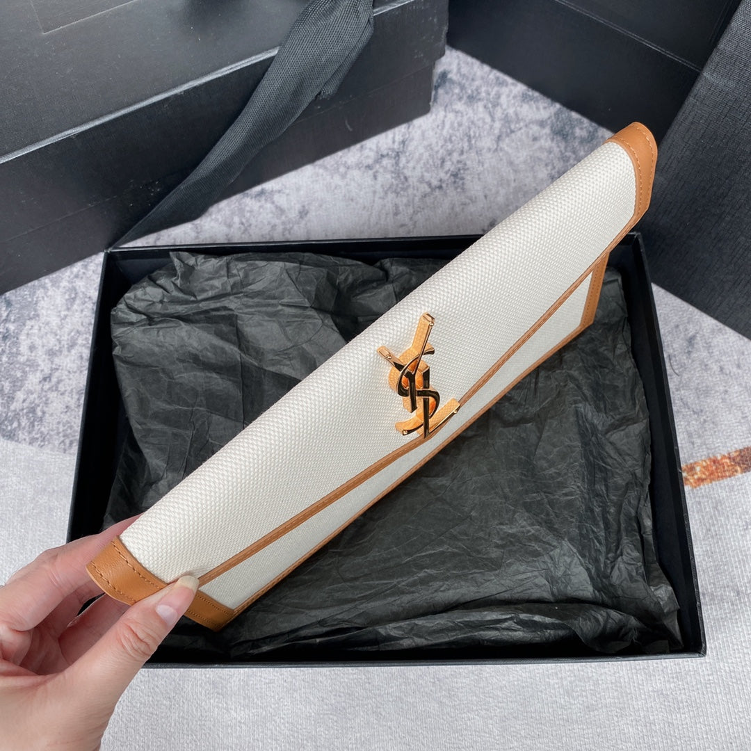 UPTOWN POUCH 27 IN WHITE CANVAS AND BROWN LEATHER TRIM GOLD LOGO