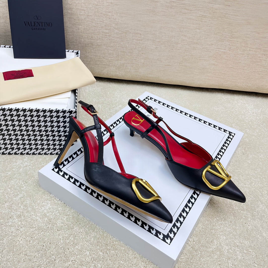VLOGO SLINGBACK PUMP IN BLACK CALFSKIN LEATHER WITH GOLD LOGO