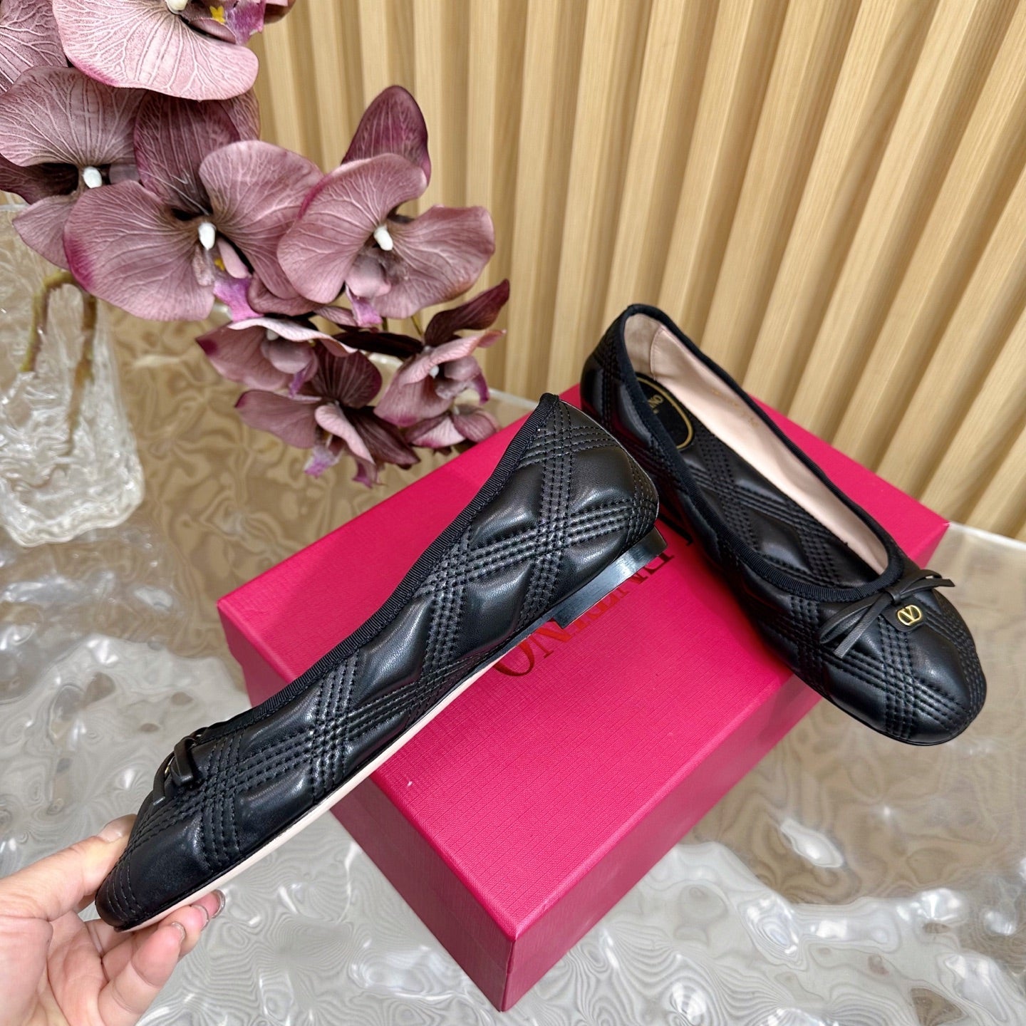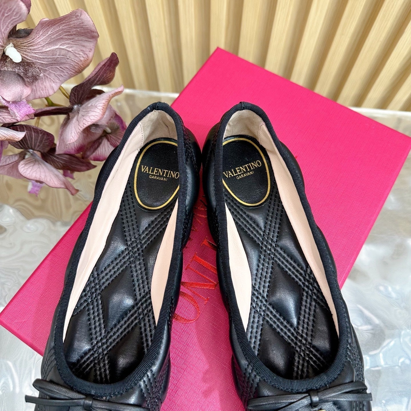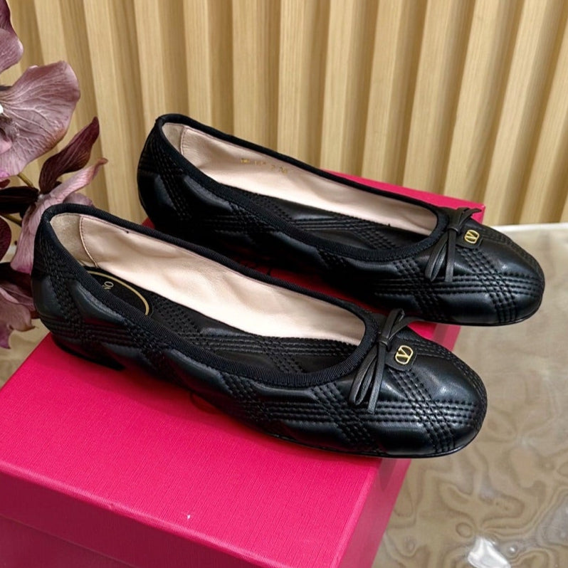 VT 2025 Quilted Leather Bow Ballerina Flats Black Sheepskin 286493