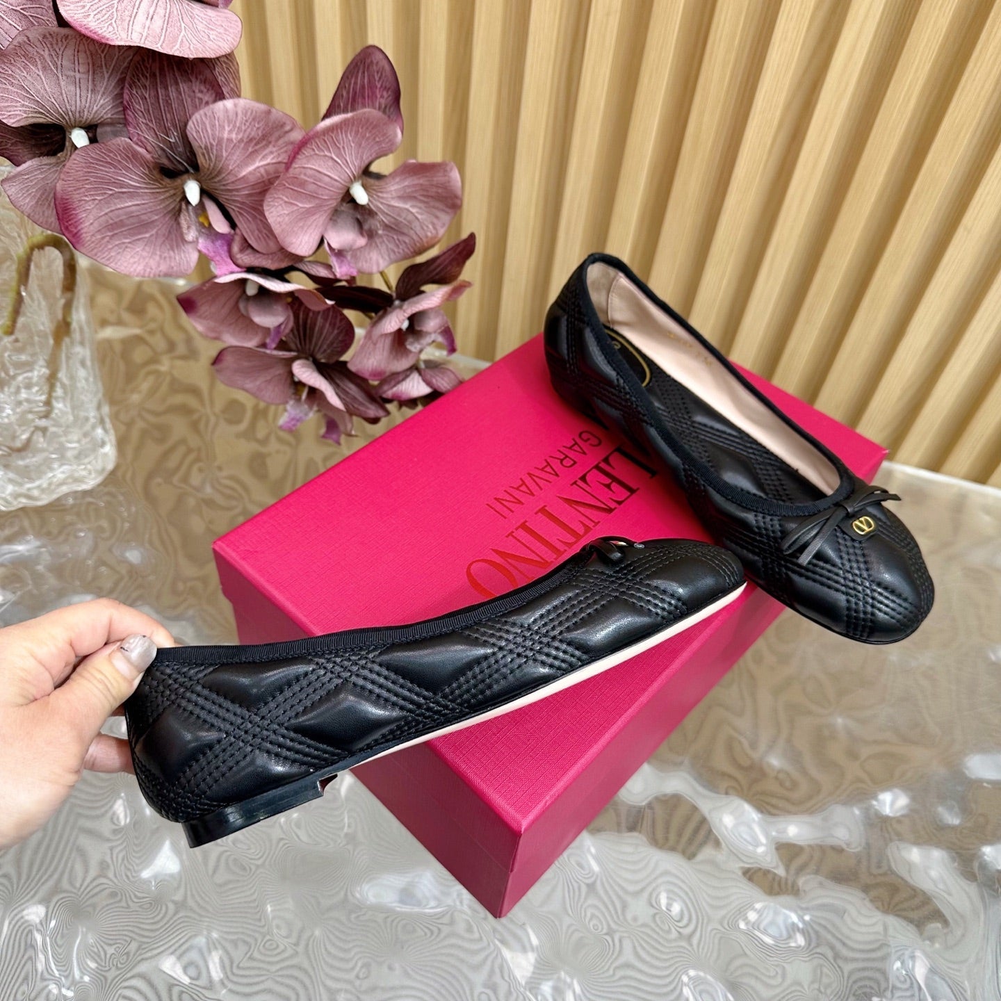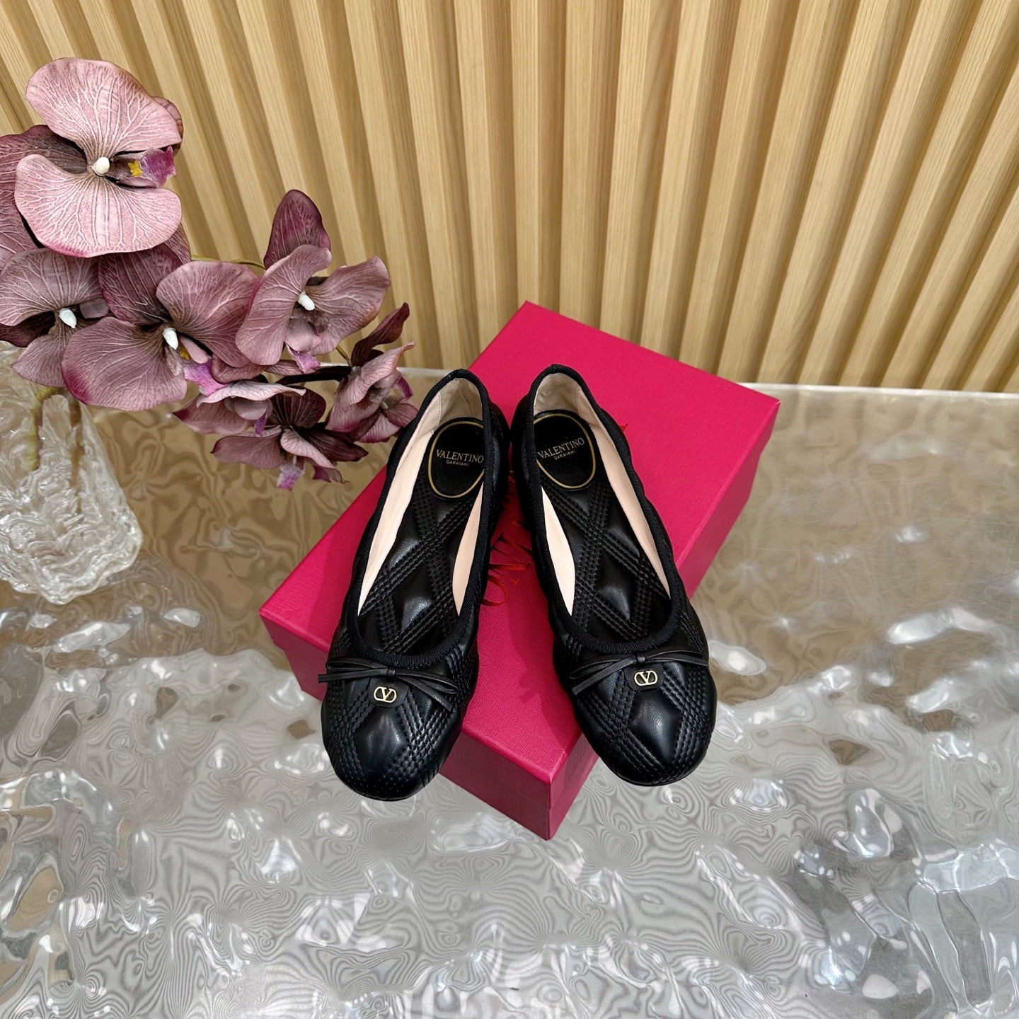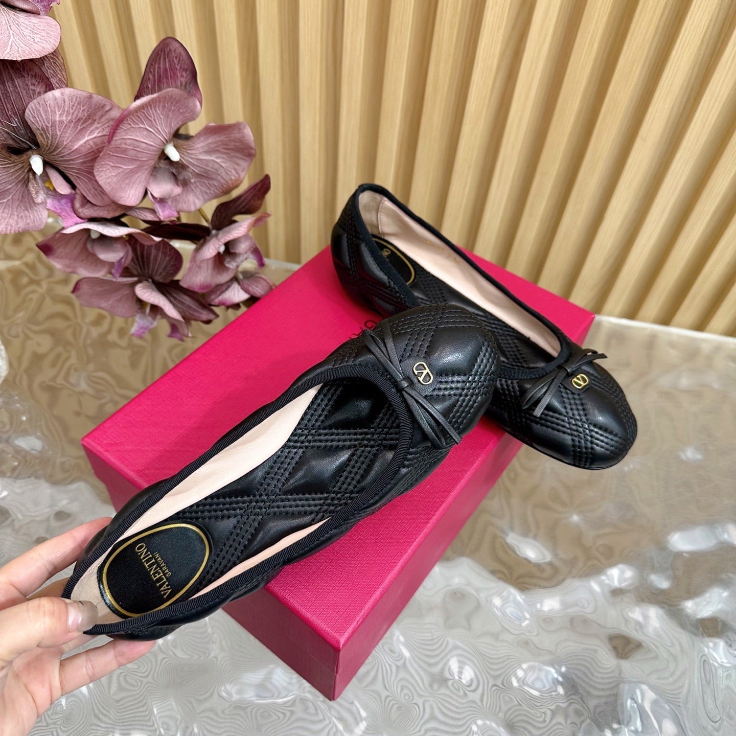 VT 2025 Quilted Leather Bow Ballerina Flats Black Sheepskin 286493