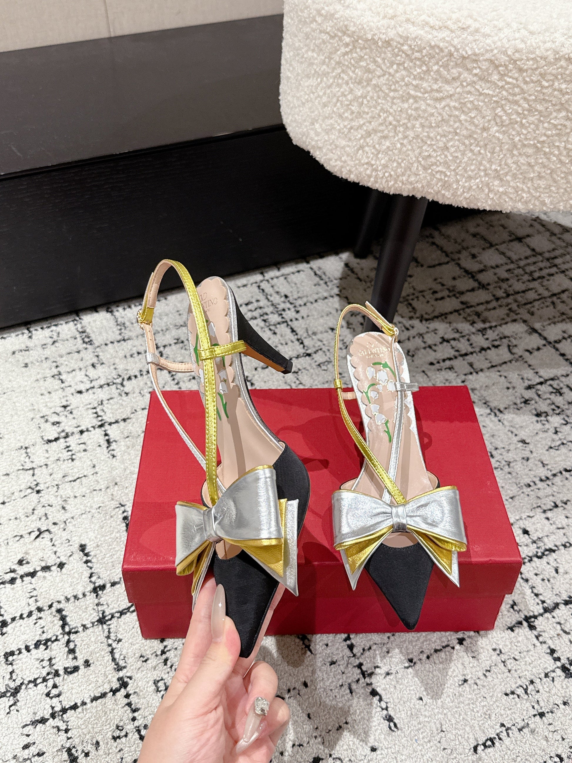 VT 25 Bowow Slingback Black Sliver Satin Sheepskin 327739