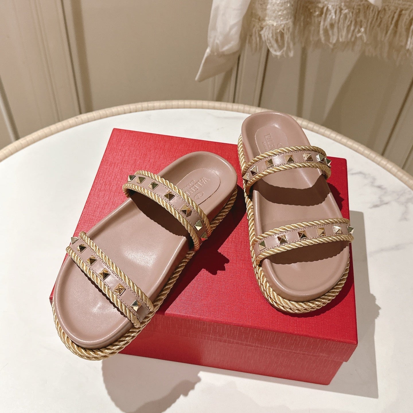 VT Rockstud Sandals Pink Nude Espadrilles Cowhide 328129