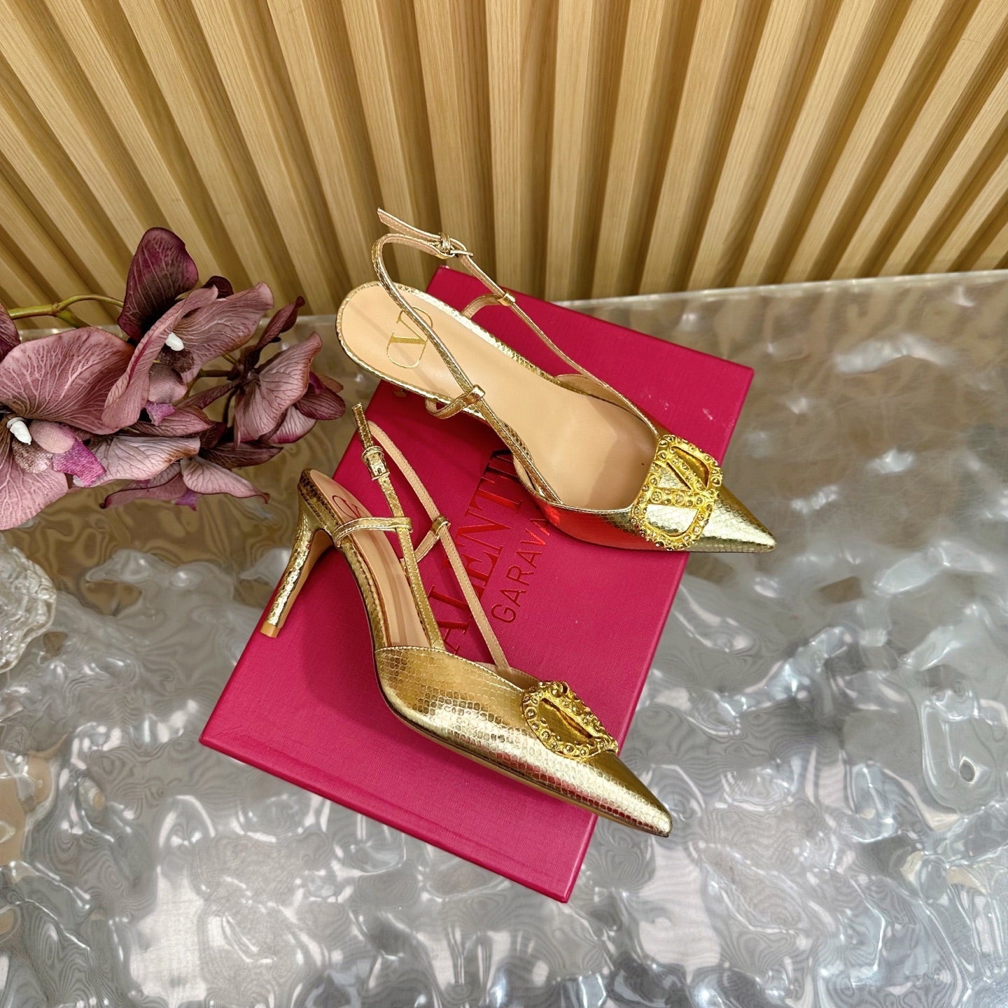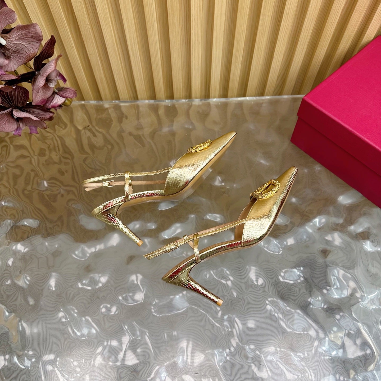 VT Slingback 8cm Gold Snake-grain Leather