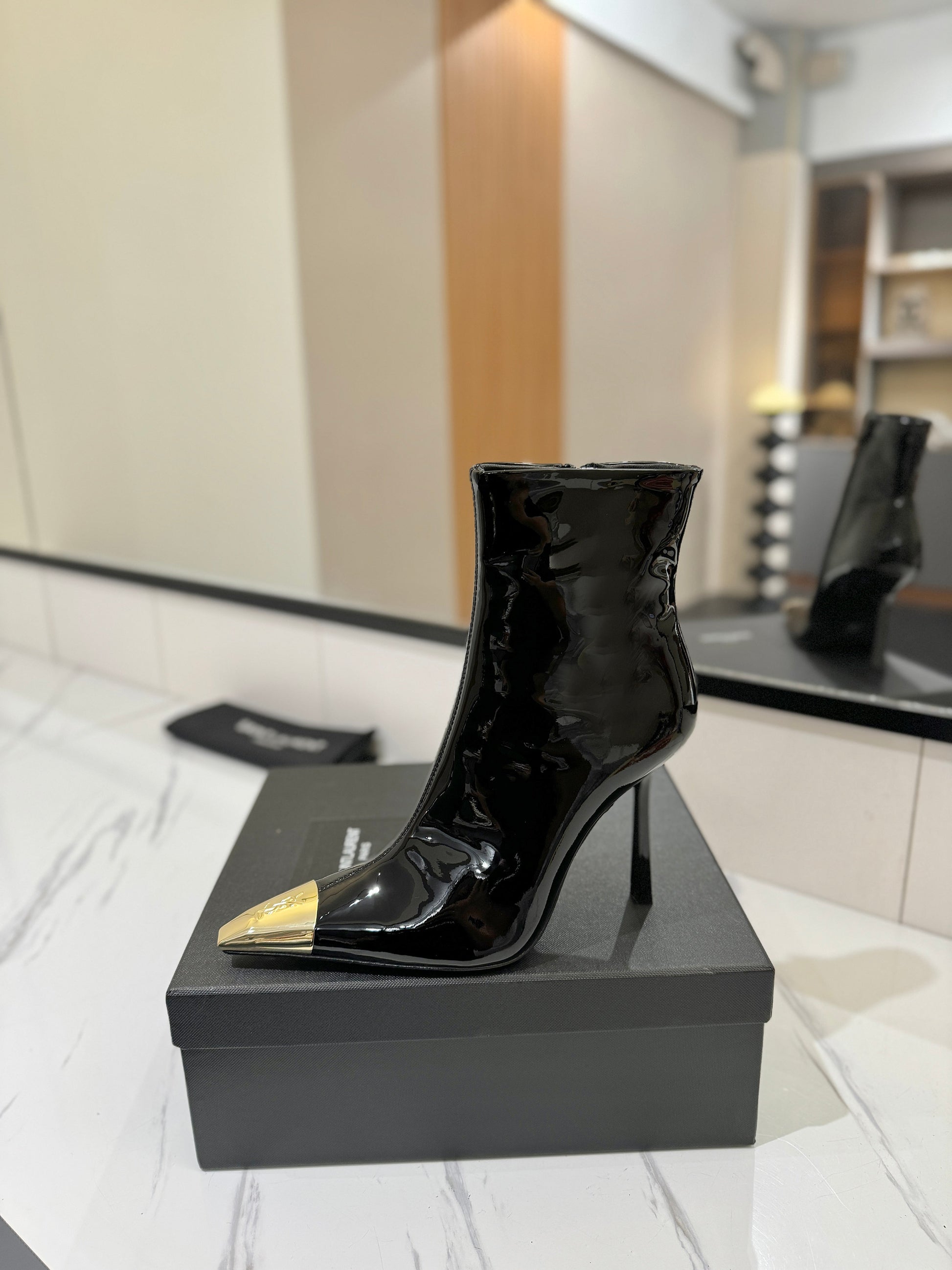 YSL 25 Metal Toe Short Boot Black Gold Patent Leather 520788
